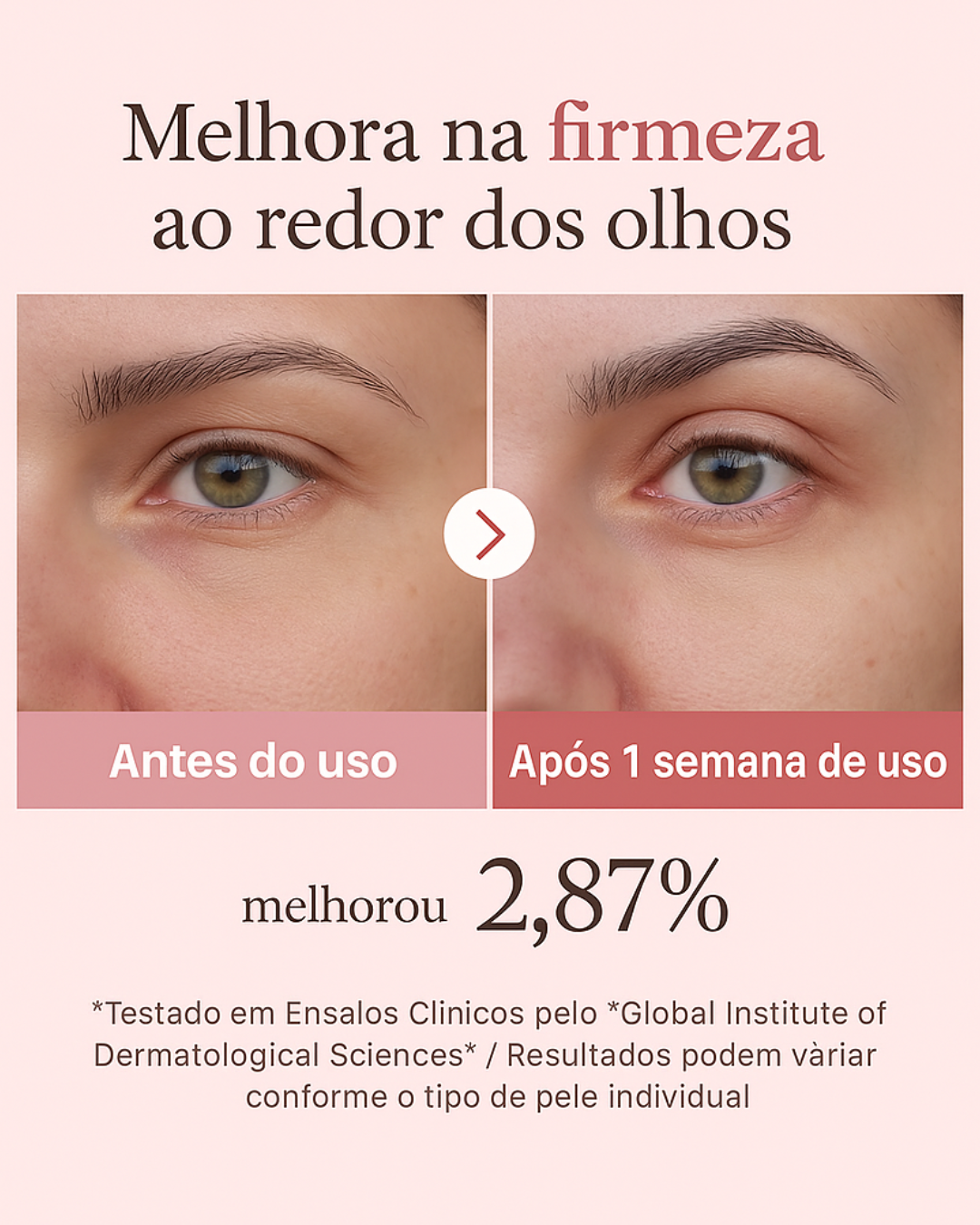 ✔ Resultados em 1 semana: melhora de 2,8% na elasticidade da área dos olhos*.